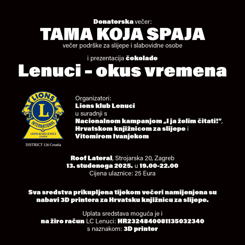 Povodom obilježavanja Međunarodnog dana bijelog štapa Lions klub Lenuci u suradnji s Nacionalnom kampanjom „I ja želim čitati!“, Hrvatskom knjižnicom za slijepe i Vitomirom Ivanjekom organizira donatorsku večer „Tama koja spaja“.